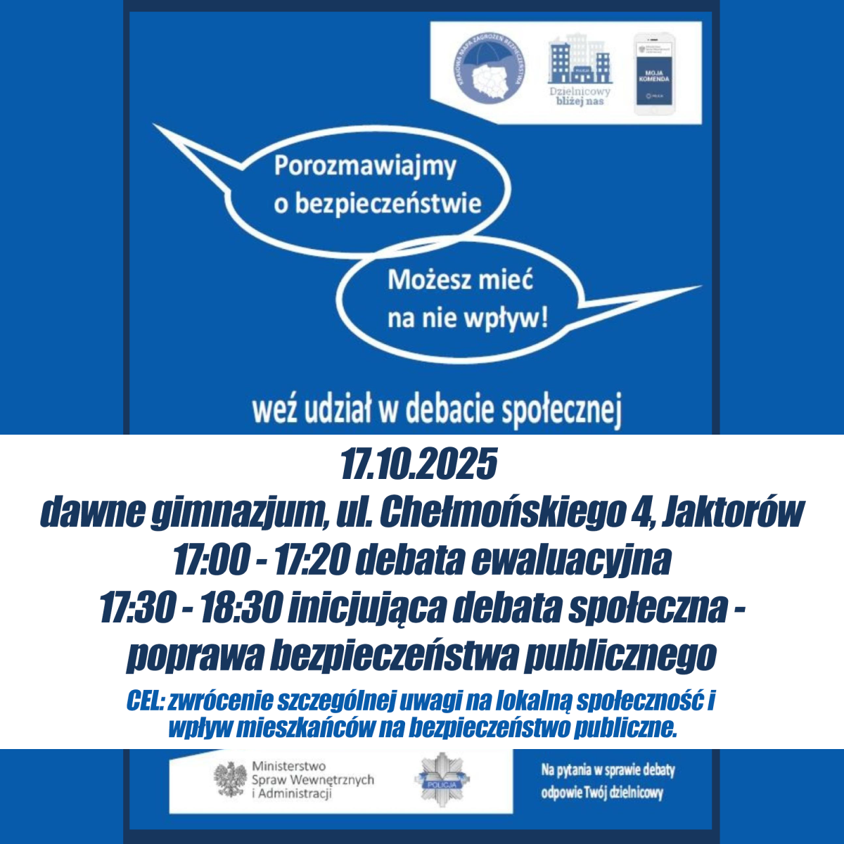 Podczas debat porozmawiamy o bezpieczeństwie w miejscu zamieszkania i przestrzeni publicznej. Będzie to okazja, by podzielić się swoimi spostrzeżeniami, zgłosić problemy i wspólnie szukać rozwiązań z funkcjonariuszami policji.