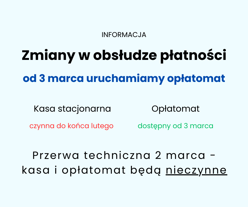 Dziękujemy za wyrozumiałość w okresie przejściowym i zapraszamy do korzystania z opłatomatu od 3 marca.