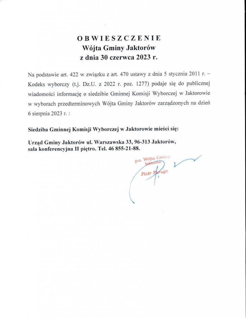 Informacja Gminnej Komisji Wyborczej w Jaktorowie powołanej w celu przeprowadzenia wyborów przedterminowych Wójta Gminy Jaktorów zarządzonych na dzień 6 sierpnia 2023 r. o składzie, siedzibie i dyżurach