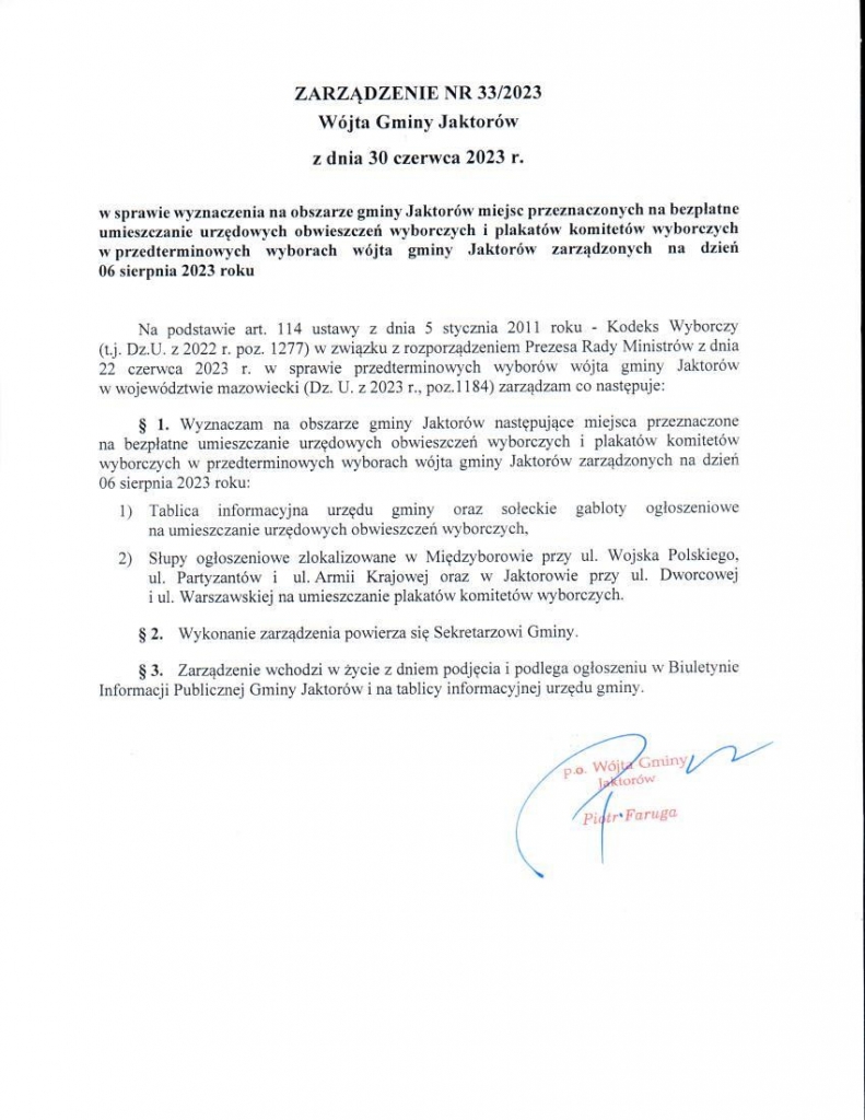 Zarządzenie Nr 33/2023 Wójta Gminy Jaktorów z dnia 30 czerwca 2023r.